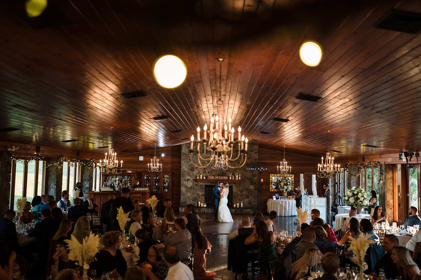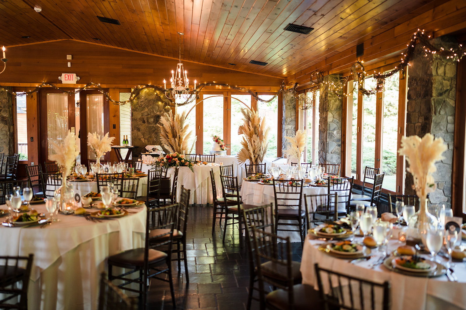 Cocktail hour is held in the Pavilion, where guests can relax, enjoy delicious food, and play lawn games. Dinner and dancing follow in Lawnhaven’s main venue, which features glass walls, a 16′ wood ceiling, and a stone fireplace, creating a private and elegant setting for your celebration.