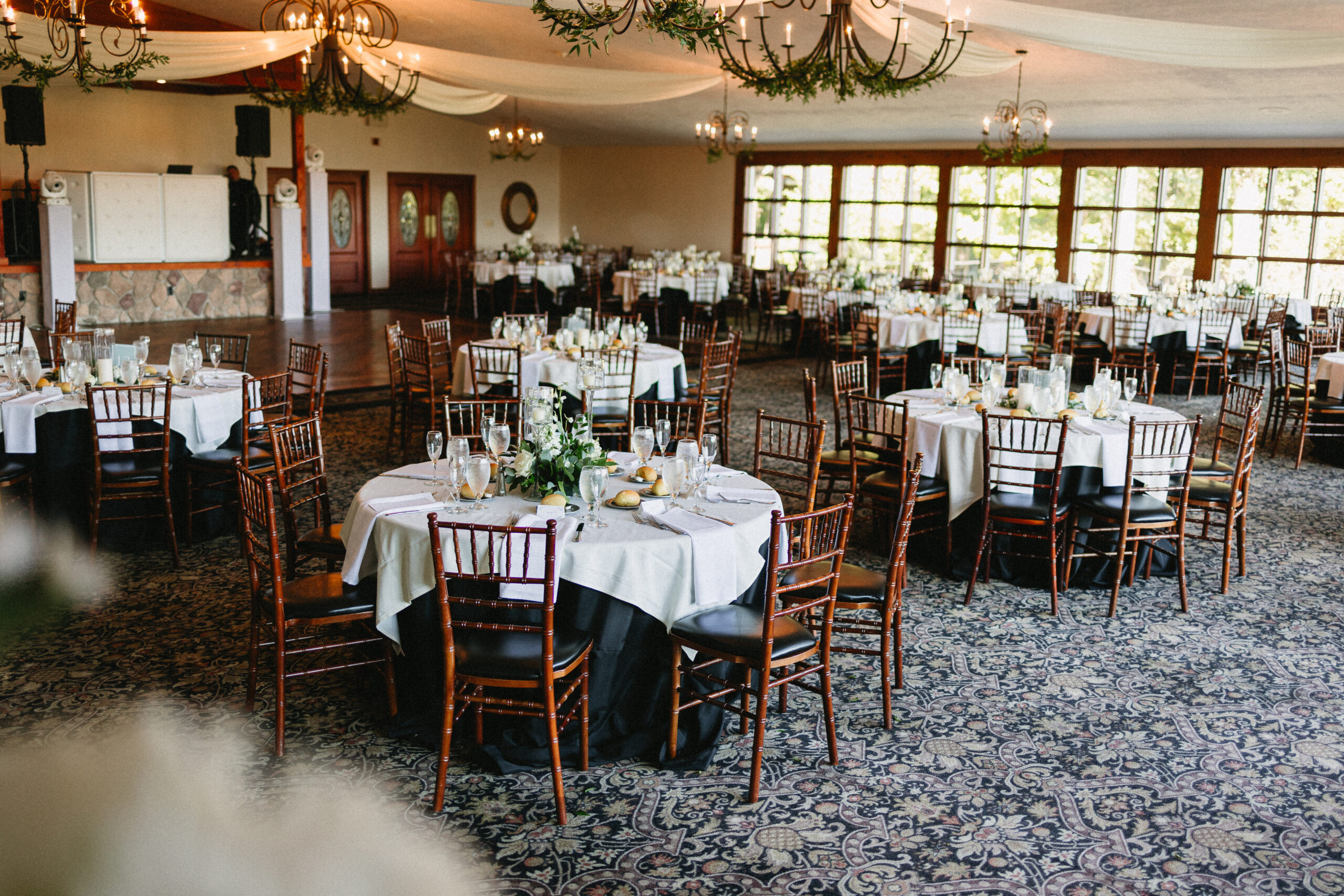 Cocktail hour is accented by a 40’ stone bar, two stone fireplaces, and plenty of room for mingling with guests indoors and outdoors under its pavilion.