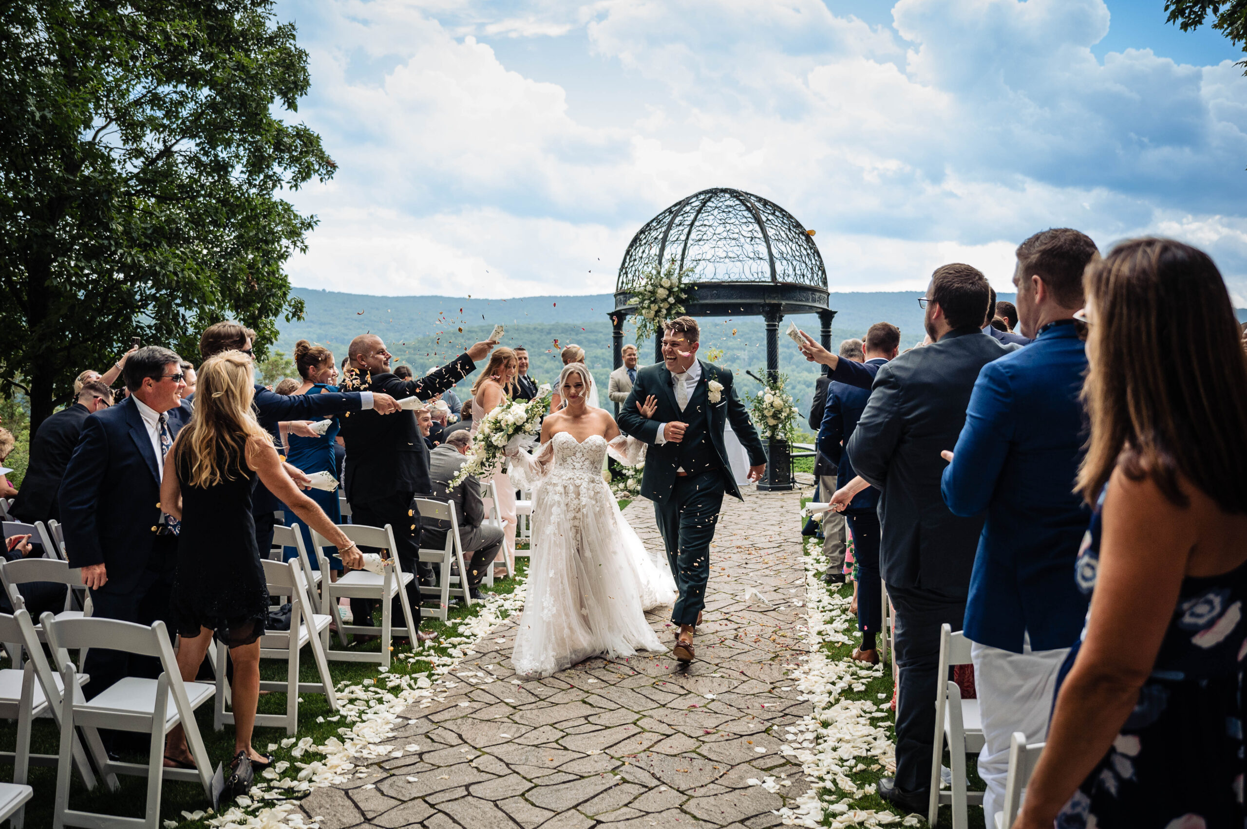 Crestview Chapel offer awe-inspiring views for every one of your 175 to 250 guests. The wrought iron gazebo sits at the edge of the mountain ridge, offering remarkable views of the Cherry Valley Wildlife Sanctuary below, and vistas stretching from Delaware Water Gap to Wind Gap and beyond.
