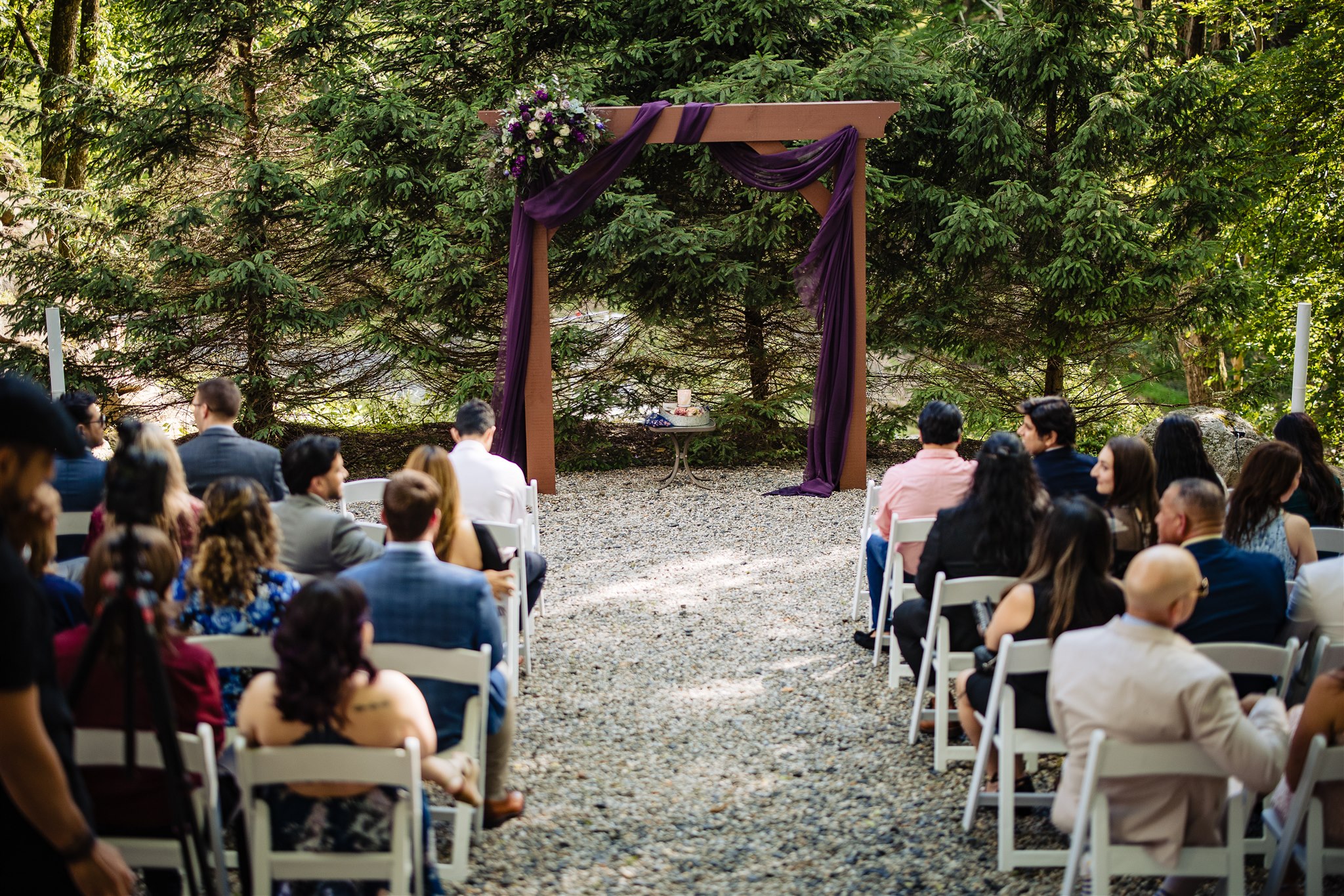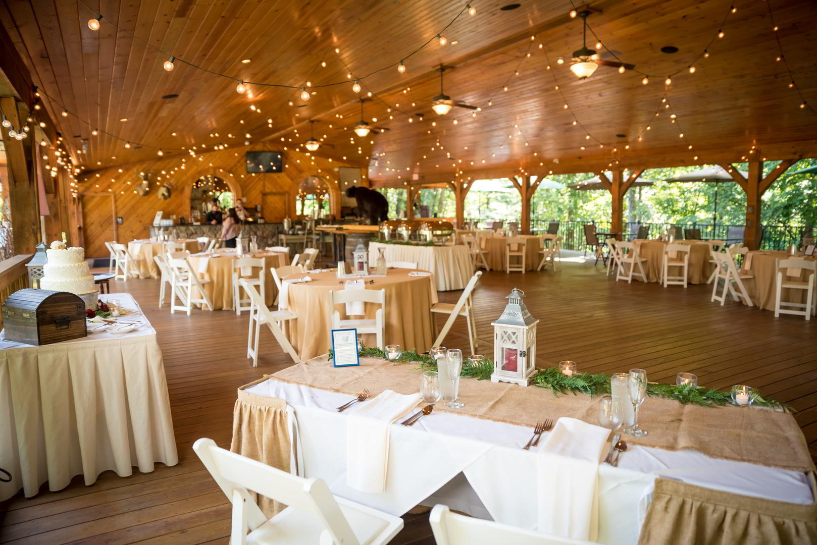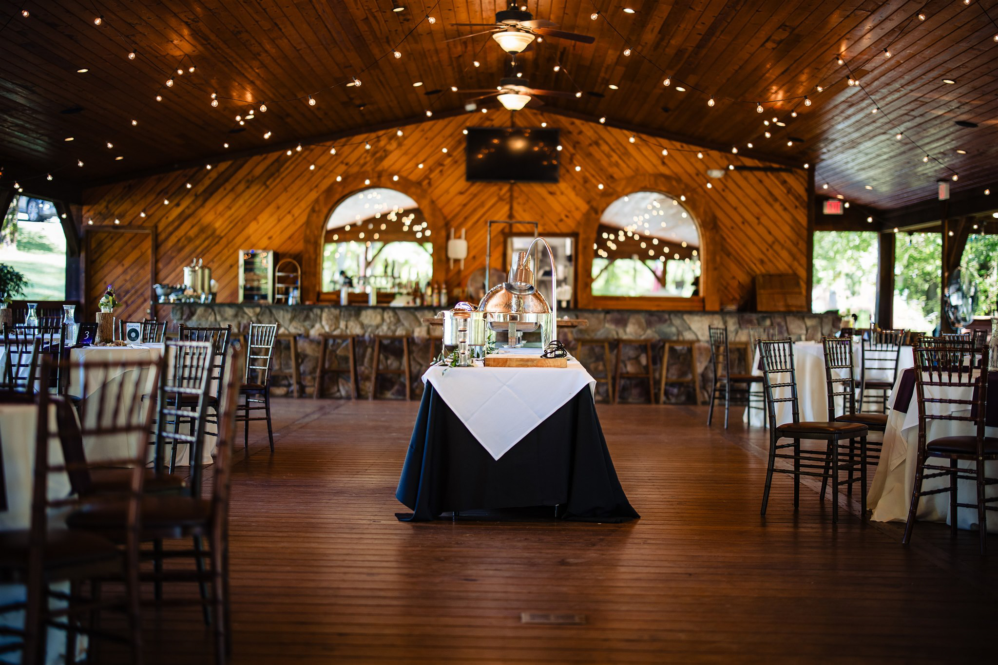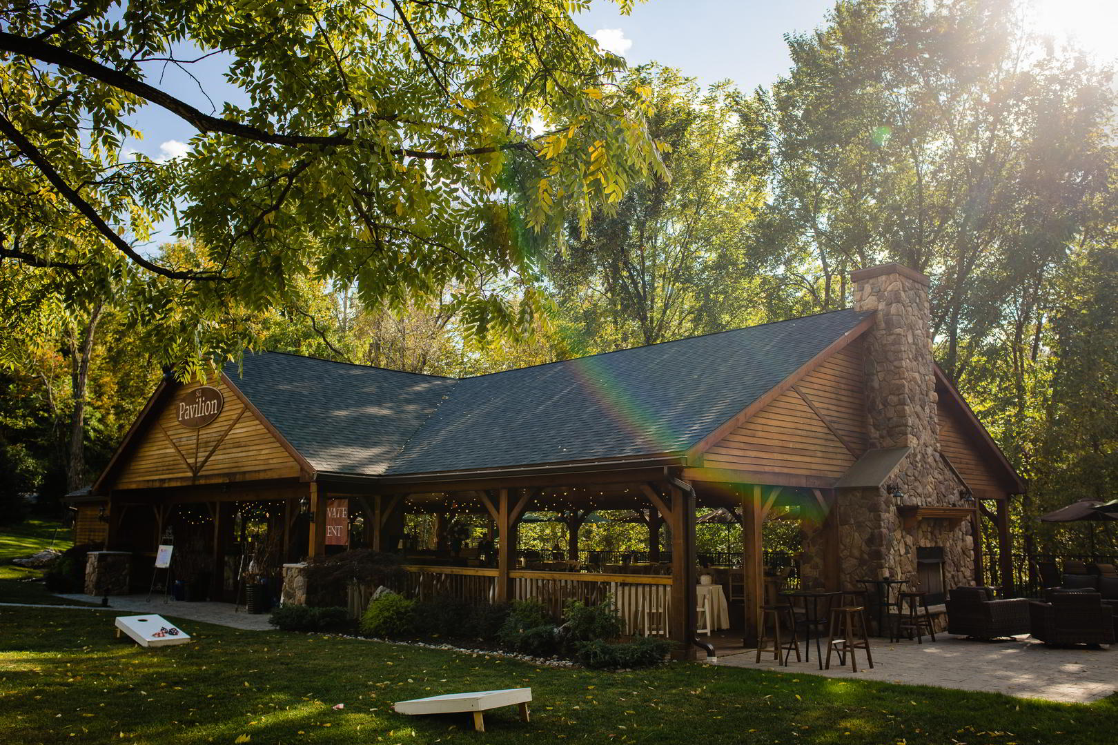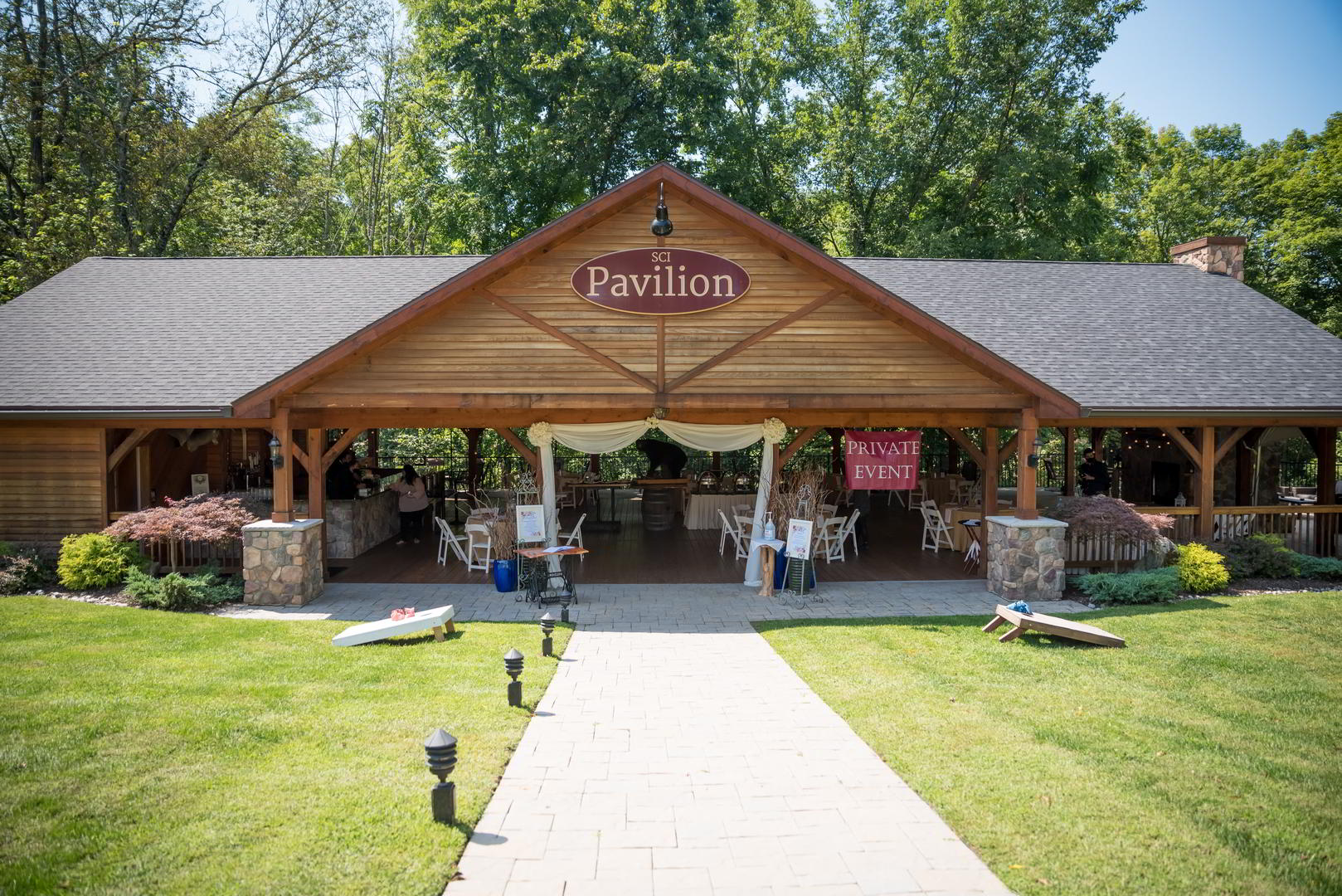 SCI Pavilion offers an open-air environment for all wedding events, including the rehearsal dinner, ceremony, reception, after-party, and post-reception breakfast, all under a 16’ cedar-lined ceiling. The venue features two fireplaces, rolling lawns for lawn games, and dozens of market lights for dancing, creating an outdoor-woodsy, urban-chic reception with plenty of style.